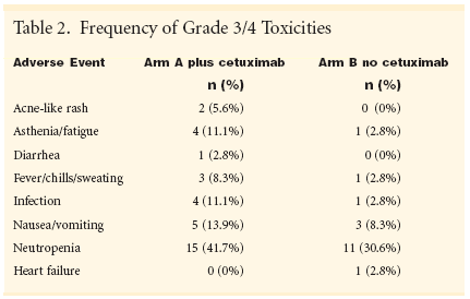 Although 61% of patients in theexperimental arm had grades 3/4 adverseevents and seven were withdrawnfrom the study, the investigators reportedthat cetuximab did not appearto increase chemotherapy toxicity.Among patients who received the standardregimen without cetuximab,69.4% had grades 3/4 adverse eventsand four could not continue on study.The most common adverse eventsin both groups were neutropenia followedby nausea/vomiting. Two patientson cetuximab experienced rash,which other researchers have correlatedwith response to EGFR-targetingagents (see Table 2)."The safety profile at this point isgood, without major increase of toxicityregarding cytotoxic chemotherapy,"Dr. Gatzemeier said. "Adverseevents like rash and the relation toresponse have to be analyzed."
