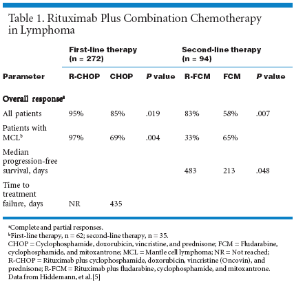 MUNICH-The prognosis for patients with mantle cell lymphoma (MCL) remains poor despite investigations of multiple combination chemotherapy strategies.[1] The 5- year overall survival rate is 27% and less than 11% of patients are disease free at 5 years.[2] Because of the beneficial effects of rituximab (Rituxan) in non-Hodgkin's lymphoma[3] and its favorable tolerability profile when added to chemotherapy,[4] Wolfgang Hiddemann, MD, PhD, professor of internal medicine at Ludwig-Maximilians- University in Munich, and other members of the German Low Grade Lymphoma Study Group (GLSG) conducted two prospective, randomized trials of rituximab plus combination chemotherapy (ASH abstract 339).[5] In the first-line treatment trial, the GLSG compared cyclophosphamide (Cytoxan, Neosar), doxorubicin, vincristine (Oncovin), and prednisone (CHOP) vs rituximab plus CHOP (RCHOP) against follicular lymphoma, immunocytoma, and mantle cell lymphomas.[ 5] The 272 patients evaluable for response included 62 patients with MCL (see Table 1).[5] Treatment with R-CHOP resulted in a significantly (P = .019) greater overall response rate compared with CHOP treatment alone. Furthermore, the time to treatment failure was 435 days for the CHOP-alone treatment group, but was not reached in the R-CHOP treatment group.
