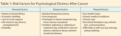 Psychological challenges are part of life. As Erikson wisely demonstrated in tracing the “crises of development” from infancy to adulthood, the specific challenges change and change us as individuals, but they are ongoing as long as we are.[4] Challenges provide opportunities for reworking past unresolved issues as well as the risk that an unresolved challenge may end in maladaptation. Cancer, though not an expected challenge, may similarly result in psychological growth as well as maladjustment. Understanding why some survivors develop ongoing emotional problems while others do not is important in identifying survivors in need of additional support and treatment. Generalizing across cancers can be difficult, but research and clinical experience suggest that several factors may predispose a cancer survivor to ongoing psychological problems[1,2] (also see Table 1). Perhaps most important are health and functional status after completion of treatment. Physical and mental health are typically strongly associated, and survivors who have chronic conditions (eg, heart disease, diabetes), and especially those with multiple chronic conditions or chronic pain, may be particularly vulnerable to problems in psychological adaptation. Similarly, those who cannot return to work or are limited in their ability to care for themselves independently may be at risk.