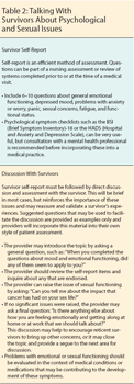 The simplest approach to a conversation may include a self-report assessment addressing emotional health, economic, social, and functional status, completed by survivors at the time of their office visit. Self-report assessment has the advantage of being simple to incorporate into each visit. It also ensures that these topics are addressed, and “primes” survivors to think about and discuss these issues with their providers. Whatever formal assessment is used, follow-up, including reviewing these responses and discussing them directly with the survivor, is essential. A brief guide to discussing these issues is presented in Table 2.