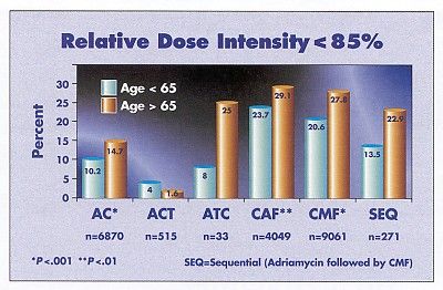 For patients receiving CMF who were age 65 years or older, 27.8% received a low relative dose intensity, compared with 20.6% of the younger patients. For patients receiving CAF who were 65 years of age or older, 29.1% received a low relative dose intensity vs 23.7% of the younger patients. By comparison, in the group receiving AC, 14.7% of older patients vs 10.2% of younger patients received a low relative dose intensity.