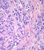 Micrograph of clear cell sarcoma. The tumor cells have prominent nucleoli and clear cytoplasm. They are arranged in well-defined nests surrounded by dense fibrous stroma; source: Jerad M Gardner, MD