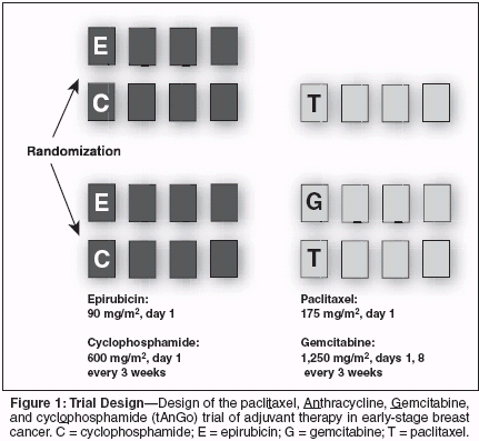 The tAnGo trial (paclitaxel, Anthracycline, Gemcitabine [Gemzar], and cyclophosphamide [Cytoxan, Neosar]) is a randomized, open-label, phase III trial designed to determine the role of gemcitabine in paclitaxel-containing epirubicin (Ellence)-based adjuvant chemotherapy for early-stage breast cancer. The combination of paclitaxel/ gemcitabine following epirubicin/ cyclophosphamide is a particularly attractive treatment option, given the responses observed in anthracyclinepretreated patients with more advanced disease who received the combination. Paclitaxel Plus Anthracycline/ Cyclophosphamide: Effect of CALGB on the tAnGo Trial Design The inspiration and rationale for the initial tAnGo trial design were provided partly by the results of the Cancer and Leukemia Group B (CALGB) 9344 trial, which added paclitaxel to standard doxorubicin/cyclophosphamide adjuvant therapy.[1] In this trial, 3,121 women with operable breast cancer and involved lymph nodes were randomly assigned after surgical treatment to receive cyclophosphamide (600 mg/m2) with doxorubicin (60, 75, or 90 mg/m2) for four cycles, followed by no further therapy or four cycles of paclitaxel (175 mg/m2). Tamoxifen was given to 94% of patients with hormone receptor-positive tumors. No dose effect of doxorubicin was apparent in the trial; disease-free survival at 5 years was 69%, 66%, and 67% in the 60-, 75-, and 90-mg groups, respectively. The addition of paclitaxel was associated with significant hazard reductions of 17% for recurrence (P = .0023) and 18% for death (P = .0064).