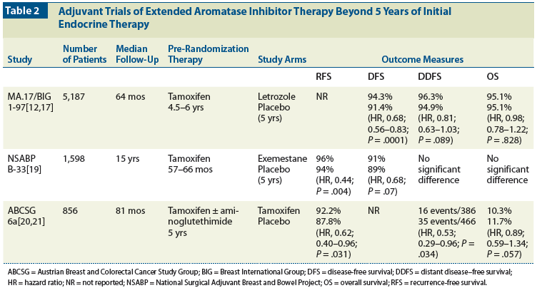 13. Petrelli F, Coinu A, Cabiddu M, et al. Five or more years of adjuvant endocrine therapy in breast cancer: a meta-analysis of published randomised trials. Breast Cancer Res Treat. 2013;140:233-40.