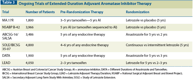 At this time, there is no evidence to support prescribing more than 5 years of AI therapy. Results are eagerly awaited from a number of trials, now closed to enrollment, that are examining this issue in women with early-stage breast cancer (Table 3). The MA.17R trial randomly assigned women to treatment with letrozole or to placebo after completion of 5 years of an adjuvant AI (either as initial therapy or after tamoxifen, including in women who participated in the MA.17 study). Similarly, the NSABP B-42 trial randomized patients who had completed 5 years of hormonal therapy (either with an AI, or sequential therapy of tamoxifen followed by an AI) to 5 years of letrozole or placebo. The ABCSG-16/SALSA (Secondary Adjuvant Long-Term Study With Arimidex) study randomly assigned postmenopausal women who had had 4 to 6 years of prior endocrine therapy to extended adjuvant treatment with anastrozole for either 2 years or 5 years. The Study of Letrozole Extension (SOLE)/International Breast Cancer Study Group (IBCSG) 35-07 randomly assigned women who had completed 4 to 6 years of any prior endocrine therapy to receive 5 years of letrozole dosed either continuously or intermittently. The Different Durations of Anastrozole and Tamoxifen (DATA) trial randomly assigned women to either 5 years or 3 years of anastrozole after 5 years of any endocrine therapy. Finally, the Letrozole Adjuvant Therapy Duration (LEAD) study randomly assigned women to treatment with letrozole for either 5 years or 2 to 3 years-after 2 to 3 years of tamoxifen. In aggregate, these trials should provide guidance about longer durations of AI therapy.