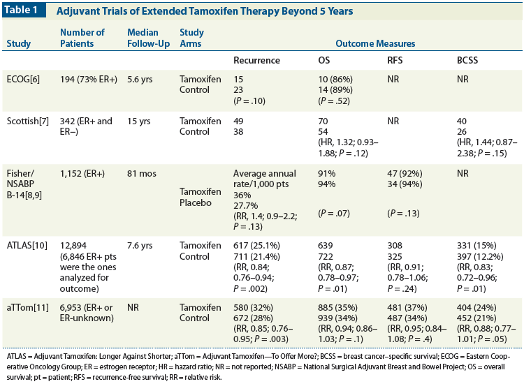 Newer data from two larger studies, the Adjuvant Tamoxifen: Longer Against Shorter (ATLAS) trial and the Adjuvant Tamoxifen-To Offer More? (aTTom) study (see Table 1), now support longer-term tamoxifen use (for up to 10 years).[10,11] Additionally, in the National Cancer Institute of Canada Clinical Trials Group (NCIC-CTG) MA.17/Breast International Group (BIG) 1-97 trial, extended adjuvant therapy with letrozole after 5 years of tamoxifen significantly reduced recurrence risk in patients with early-stage breast cancer, compared with placebo, supporting the use of extended aromatase inhibitor (AI) therapy after tamoxifen.[12] However, uncertainty remains regarding the best total duration of AI therapy, since there are no direct comparisons of various AI dosing strategies-such as initial, sequential, and extended adjuvant-nor are there comparisons of these treatments with extended tamoxifen therapy. Despite these gaps in our knowledge, a definitive signal has emerged in favor of extended endocrine therapy beyond 5 years for women with early-stage breast cancer. A recent meta-analysis of eight published randomized trials showed that for ER-positive breast cancer, extended adjuvant therapy after 5 years of tamoxifen yielded significant improvements in overall survival (odds ratio [OR], 0.89; 95% CI, 0.80–0.99; P = .03), breast cancer–specific survival (BCSS) (OR, 0.78; 95% CI, 0.69–0.90; P = .0003), and RFS (OR, 0.72; 95% CI, 0.56–0.92; P = .01). This translated to a 36% reduction in local regional relapse and a 13% reduction in distant relapse. Extended adjuvant endocrine therapy, compared with 5 years of tamoxifen alone, reduced the risk of death by 10% and the risk of relapse by 30% in patients with ER-positive breast cancer.[13]