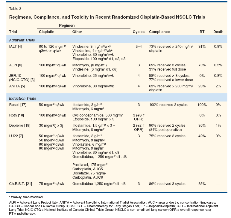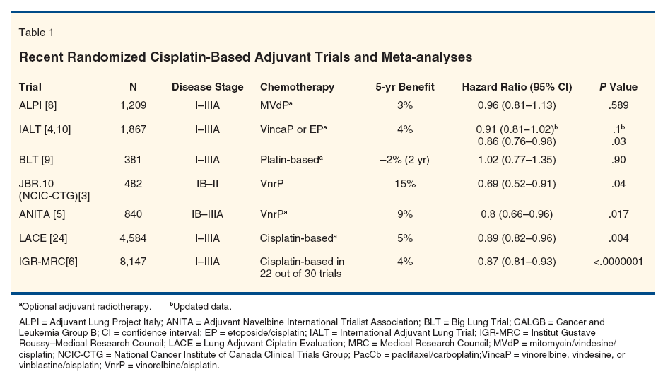 4. Arriagada R, Bergman B, Dunant A, et al, for the International Adjuvant Lung Cancer Trial Collaborative Group: Cisplatin-based adjuvant chemotherapy in patients with completely resected non-small-cell lung cancer. N Engl J Med 350:351-360, 2004.