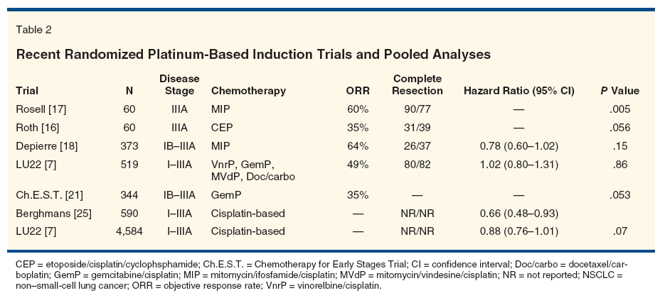 The study by Rosell and colleagues concerned cN2 patients treated by either surgery or three cycles of MIP (mitomycin/ifosfamide/cisplatin) followed by surgery and radiotherapy.[17] Objective response rates were reported in 60% of the cases. Updated median survival was 22 months for the induction therapy group and 10 months for controls (P = .005). Some have suggested that the unusually low survival in the control arm (0% at 5 years) might be the result of a study bias.