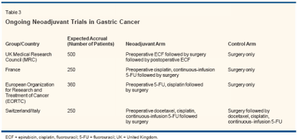 gressive disease, and a nonsignificantimprovement in resection rates wasseen in the surgery-only arm. Moreover,patients randomized to preoperativeFAMTX did not experienceany survival benefit compared to thosereceiving surgery alone. Preliminaryreports of neoadjuvant chemotherapytrials conducted in Asia have alsofailed to demonstrate improved survivalrates for preoperative therapy.[32,33] Several large, randomizedtrials are currently being conductedin Europe to evaluate the role of neoadjuvantchemotherapy in the treatmentof gastric cancer (Table 3).[14]Adjuvant Chemoradiotherapy