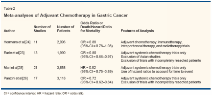 The administration of chemotherapyshortly after complete resectionof gastric tumors in patients at highrisk of recurrence has been assessedas a means of treating clinically undetectablemicrometastases. A numberof studies have investigatedwhether adjuvant chemotherapy canreduce the incidence of the diseaserecurrence and mortality followinga curative resection. To date, four meta-analyses have been publishedthat examined the impact of postoperativeadjuvant chemotherapy onsurvival after surgical resection(Table 2).[23-26]