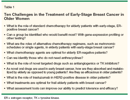 Breast cancer in older women will become an increasingly common diagnosis as the population continues to age. Many challenges remain in the treatment of these patients. Many have hormone receptor–positive disease, and hormonal therapy is a mainstay of treatment in these women. Chemotherapy provides a clear benefit in healthy older women with ER-negative disease. However, the benefits of chemotherapy in ER-positive disease are unclear, and much work is needed to answer a number of important questions: (1) What is the role of standard adjuvant chemotherapy in this group? (2) What is the role of alternative adjuvant chemotherapy regimens such as metronomic schedules or single agents? (3) What is the role of other drugs such as bisphosphonates or novel targeted antineoplastics? (4) What options are there for frail patients? (5) How can we better predict tolerance and efficacy for any of these regimens? (6) Can predictive tools such as gene-expression profiles identify older women most likely to benefit from treatments? Further, the role of trastuzumab, with or without chemotherapy or hormonal therapy, must be better defined in older patients. Increasing attention to these important issues will result in focused clinical trials, which will allow the development of evidence-based recommendations for this growing group of breast cancer patients.