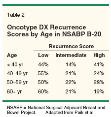 The question then is whether the specific group of patients who benefit can be identified, and whether the RS was able to do so. For patients with a low RS, chemotherapy provided no benefit over tamoxifen alone. For those with a high RS, the benefit from the addition of chemotherapy was large, with a 28% absolute reduction in 10-year DRFS (P = .001). While age was not found to be a predictive factor, a high recurrence score was found in 41% of patients under age 40, 24% of patients 40 to 49, 28% of patients 50 to 59, and only 19% of patients over 60 (Table 2).[30] This indicates that among women with ER-positive, node-negative breast cancer, while fewer elderly patients will benefit from the addition of chemotherapy compared to their younger counterparts, a percentage of women in the elderly group will derive significant benefit.
