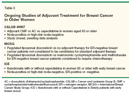 For example, the CALGB recently completed a study comparing 6 months of oral capecitabine (Xeloda) vs standard adjuvant chemotherapy in women over age 65 with early-stage breast cancer (Table 3). Results of this study are anxiously awaited. In addition, the International Breast Cancer Study Group (IBCSG) is investigating pegylated liposomal doxorubicin (Doxil) vs no therapy as well as pegylated liposomal doxorubicin vs a low-dose metronomic schedule of oral cyclophosphamide and oral methotrexate in elderly women who are not considered candidates for standard chemotherapy.
