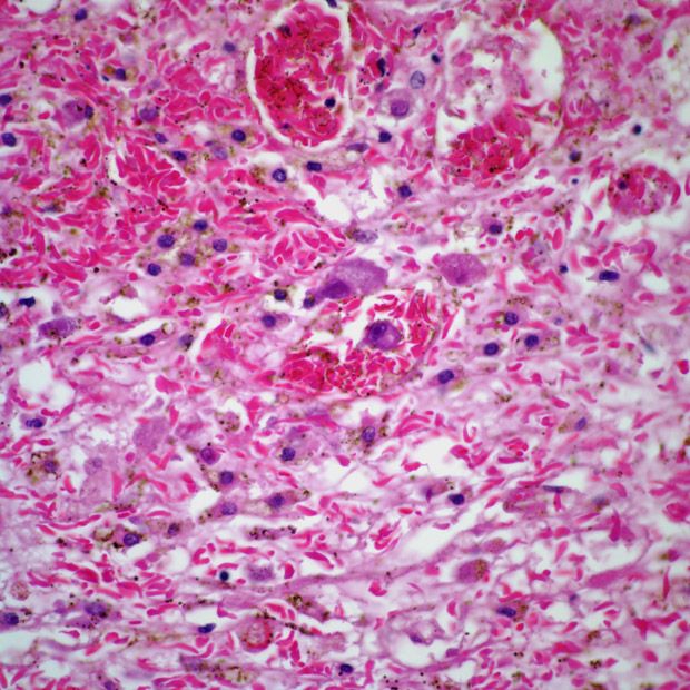 A 30-year-old man presents with a lesion in his right adrenal gland, and a biopsy is performed.