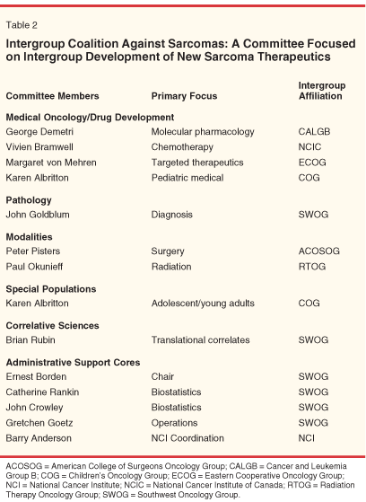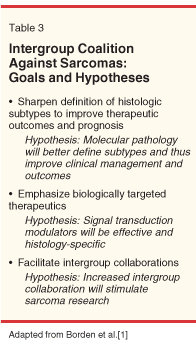 Leaders in pathologic and clinical sarcoma research realized that the 21st century was going to offer a new opportunity to further improve outcomes for sarcoma patients (Table 1). The use of small molecules with a known oncogenic target, whether resulting from a mutation or translocation, could be a base for entirely new approaches to the treatment of sarcomas. In the fall of 2000, a core group of medical oncologists and biostatisticians with a history of good interactions began discussing a new structure for cooperative group sarcoma research. Since only the Southwest Oncology Group (SWOG) had a peer-reviewed and approved sarcoma committee, this was viewed as a base from which to begin new intergroup collaborations-an initiative that evolved into the Intergroup Coalition Against Sarcomas (ICAS).