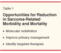 Much more remains to be done if the promise of molecular definitions and imaging are to be fully developed to reduce morbidity and mortality from sarcomas. Of course, morbidity and mortality would also be further decreased if we continue to educate our colleagues in primary care of the importance of biopsy of any mass that is enlarging, tender, or greater than 3 to 5 cm in size. Broad participation by cooperative group members will ensure reductions in morbidity and mortality from adult sarcomas, as has resulted from the efforts of pediatric oncology colleagues. As the articles in this series will illustrate, the ideas and opportunities exist.