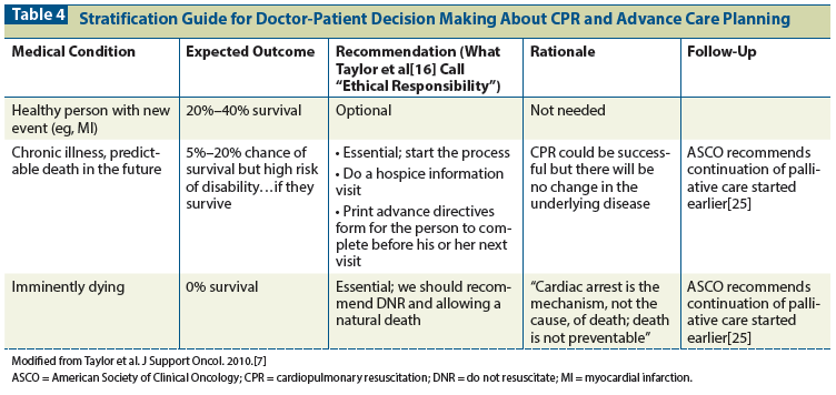 This approach works well for the imminently dying-patients who predictably won’t survive a “code” but have someone in the family who wants to prolong their life. Explaining that the chance of success is essentially zero, and that CPR won’t fix the cancer, can be hard but effective (see Table 4).