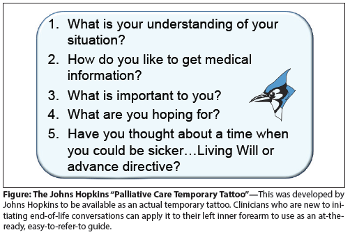 At our institution, we have come up with a script that we are having made into what we are calling a “temporary tattoo” for advance care planning discussions. Such discussions can be very difficult both to start and to finish. It can help to have the lead-off gambit ready to go. This starts with, “What is your understanding of your situation?”[6] and then continues with the subsequent follow-up questions as appropriate (Figure).
