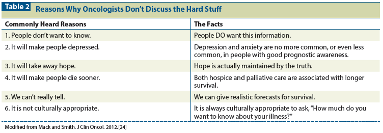There is not a single shred of evidence that, for the patient who wants to know-and most people these days do-providing information about advance care planning, code status, and prognosis is harmful. Some of the commonly heard reasons for not discussing these things-and facts that rebut them-are listed in Table 2.