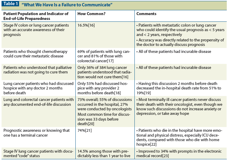 As oncologists, most of us take pride in being good communicators. However, just like with pain management, the effectiveness of our communication must be measured.[1] What our patients report, and what some of the subsequent outcomes may indicate, is that we have been mistaken in what we thought was communicated (Table 1). If understanding-and accepting-the disease process is important to good decision making, we have a ways to go in terms of providing our patients with all the information they need relative to their end-of-life (EOL) care.