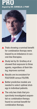 Sequential treatment is a valid option for the majority of patients with advanced colorectal cancer. The pivotal trials of combination therapy do not convincingly demonstrate that sequential delivery is inferior in most patients, argued Dr. Punt, a professor in the department of medical oncology.