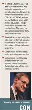 Dr. Punt argued that combinations may be preferred if tumor shrinkage is the goal or salvage therapy is not feasible, but in most patients sequential treatment is valid and may be very useful in conjunction with newer agents. Dr. de Gramont argued that sequential monotherapy should be limited to those relatively few patients who have comorbidities or are too frail to receive a combination therapy, or those who have a good performance status and no chances of salvage surgery, benefit of maintenance therapy or chemotherapy breaks.