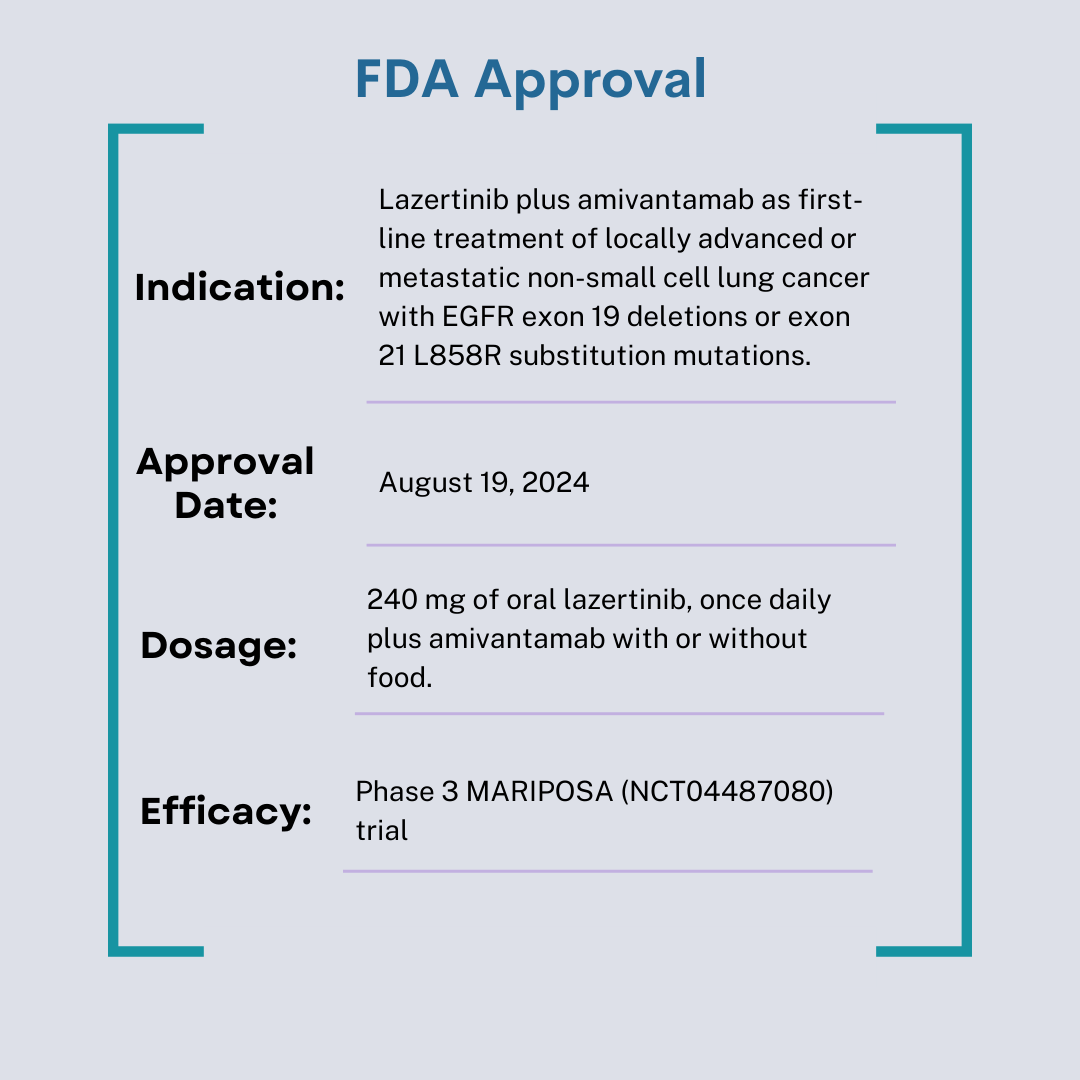 For EGFR mutations discovered during the first line, amivantamab and lazertinib were added. You can now add carboplatin, pemetrexed, and amivantamab as second-line treatment based on the phase 3 MARIPOSA-2 trial [NCT04988295].1 We have a few patients who received that regimen and are doing well. Then [for] exon 19 and 21 mutations based on the phase 3 MARIPOSA trial [NCT04487080] we will use a combination of lazertinib and amivantamab.2 We will talk about who could potentially be patients who may receive that.