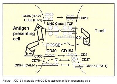 The most common vectors being studied in an attempt to achieve this goal are plasmids that carry DNA into the cell or viruses that transfer genes into the cell (such as adenovirus and herpes simplex virus). Dr. Kipps said that considerable interest is currently centered on the CD154 protein, which is expressed on T cells soon after T-cell activation and that interacts with CD40. This leads to activation of antigen-presenting cells that can induce T-cell proliferation and cytokine production. (See Figure 1.) Researchers are using infection with an adenovirus-CD154 construct to convert "stealth" leukemia cells into "alarm" antigen-presenting cells (APC) that can activate the immune system against leukemia cells.