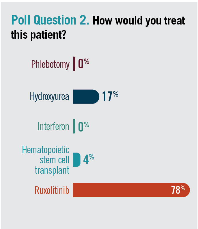 In a polling question, most of the audience indicated that that they would treat this patient with ruxolitinib (poll question 2).