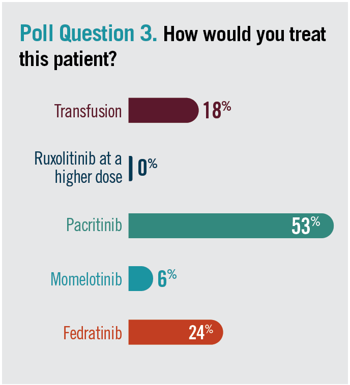 In a polling question, most of the audience indicated that that they would treat this patient with pacritinib (poll question 3).