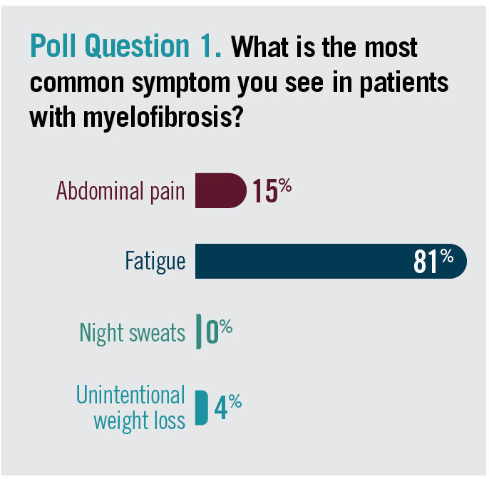 In a polling question, the audience indicated that fatigue was the most common symptom they saw in their patients with myelofibrosis (poll question 1).