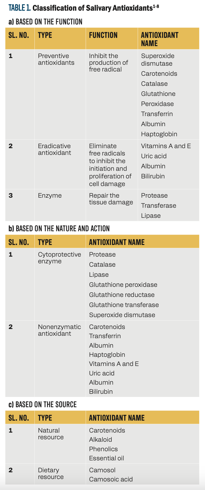 To counteract these free radicals, a protective mechanism, such as antioxidants, will be released to protect and neutralize free radicals, (ie, improve the oxidative status), and maintain the health of the individual. If the optimal balance between the oxidants and antioxidants is broken, then the natural defense system fails, which leads to various diseases and disorders. Antioxidants, also called free radical scavengers, are molecules capable of inhibiting the oxidation of another molecule. Antioxidants are classified based on function, nature and action, and source (Table 1).1-8 Currently, there is a burgeoning fascination with the connection between antioxidants and oral diseases, as the precise impact of excessive reactive oxygen species production stemming from inflammation or insufficient antioxidant presence remains enigmatic.1,8 This article explores the role of saliva in revealing the interplay between oxidative stress and oral health, emphasizing the importance of antioxidants in maintaining balance and preventing diseases.