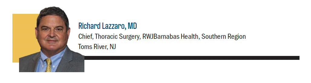Lazzaro / Advances in lung cancer management have been tremendous. More patients can be treated [and experience] improvements in long-term survival. A lot of that comes from having a multidisciplinary thoracic tumor board that includes medical oncologists, radiation oncologists, pathologists, radiologists, pulmonary physicians, and thoracic surgeon oncologists. When you can review a [patient’s] history, images, and pathology and relate them to clinical and pathologic staging, you can take that [patient’s] current extent of disease and confirm the collective decision of the group in how you will treat these patients. Then you get to follow up and represent those patients for their response to treatment and then determine their next course of care. Sometimes it’s surgery first, with no adjuvant therapy and just surveillance. Sometimes a patient has very early cancer and they’re not a great surgical candidate because of an unhealthy heart, lungs, kidneys, or liver, making them a candidate for stereotactic body radiation therapy, stereotactic ablative radiotherapy, or CyberKnife.
