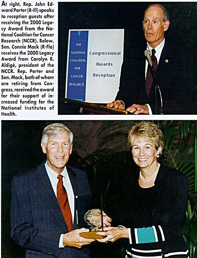 Rep. John Porter (R-Ill) and Sen. Connie Mack (R-Fla) received the first- ever Legacy Award from the National Coalition for Cancer Research (NCCR) during an evening reception. They were also presented the Lifetime Award of the Cancer Research Foundation of Americas Congressional Families Action for Cancer Awareness at a luncheon.
