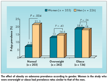 Among the overweight and obese women, the prevalence of polyps was 13%, compared with 14.6% for men, and the prevalence of advanced neoplasms was 18.6% for women, compared with 18% for men.