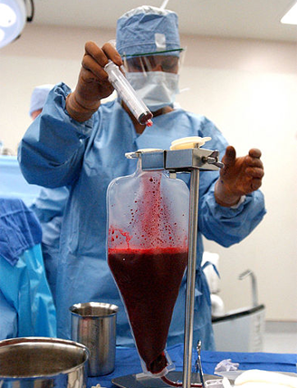 A surgical technician places recently transfused bone marrow into a sterile bag in preparation for transplant.