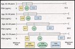If the variance in PSA values is related to the "normal" pattern of prostatic function, it would stand to reason that men in their 40s, when benign prostatic enlargement and prostate cancer are uncommon, would show the least variance in PSA values. With increasing age and greater variability in circulating androgen levels, various endogenous prostatic insults, and other physiologic factors that may be environmentally influenced, some prostates will be stimulated to grow--whether that growth is benign or malignant--whereas others will not.[57] Thus, greater variability is found among PSA levels of successively older men (Figure 1).