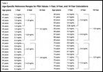 Ten-year age groupings for age-specific reference ranges may simply be too inclusive (and less sensitive than 4.0 ng/mL) for clinical applicability at this time. Five-year age-specific reference ranges, or even an annual reference point (at the 95th percentile), may provide a sound criterion for clinical interpretation. Based on more than 77,000 individual PSA test results, previously analyzed in 10-year age groups,[37] Table 4 presents the increasingly more specific reference points by 10-, 5-, and 1-year age groupings. For each year of age after the age of 45, more than 1,000 PSA test results provided the basis for computation.