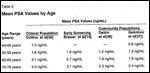 As discussed elsewhere,[37] age-specific reference ranges are a result of the increasing mean PSA values and the increasing PSA variance (standard deviation) in successively older cohorts of men. Mean PSA values are related to the population studied and may also be related to the time during which a particular study was conducted (Table 2). The variability in PSA values as men age suggests that caution should be exercised when considering the clinical implications of age-specific reference ranges.[56] The upper limits are established by two methods: (1) extending mean PSA levels upward two standard deviations to establish a 95% confidence limit, or (2) extending the median PSA value to the 95th percentile. However, the distribution of PSA values in any age group is not a normal distribution: absolute 0.0 ng/mL is always the lowest value.