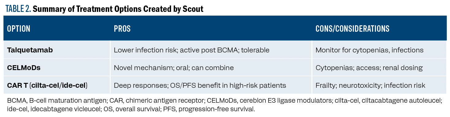 1 GPRC5D-targeted bispecific antibody (eg, talquetamab [Talvey]): After failure of BCMA-targeted therapy, switching to a GPRC5D-targeted bispecific antibody such as talquetamab is supported by current expert consensus. Ajay Nooka, [MD, of Emory Winship Cancer Institute] and colleagues highlight that talquetamab is particularly suitable for patients with poor organ function, cytopenias, and high infection risk, as it is associated with a lower rate of severe infections compared with BCMA bispecifics (grade 3 infections less than 10% vs greater than 50% for BCMA bispecifics) and does not require Pneumocystis jirovecii pneumonia prophylaxis as monotherapy. This makes it a strong option for patients with significant comorbidities, including renal dysfunction and cytopenias, as in your case.