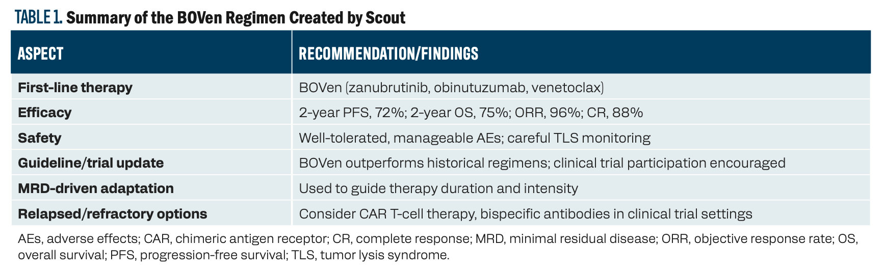 2. Best current treatment option: The most promising regimen is the BOVen combination: zanubrutinib (Brukinsa; a [Bruton tyrosine kinase] inhibitor), obinutuzumab (Gazyva; an anti-CD20 antibody), and venetoclax (Venclexta; a BCL-2 inhibitor).