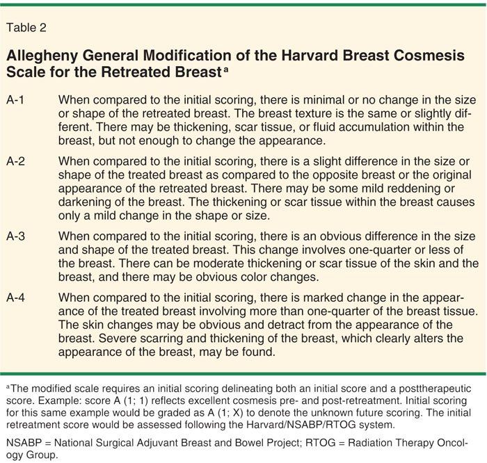 ABSTRACT: ABSTRACTThe use of brachytherapy-and to a lesser extent, external-beam radiotherapy-in the management of locally recurrent breast cancer following ipsilateral breast tumor recurrence (IBTR) followed by repeat breast-conservation surgery and irradiation is currently an area of intense study. The current cosmetic scoring system is inadequate to score the outcome resulting from retreatment because it does not account for the cosmetic effect of the initial treatment. We propose a modification of the scale for patients who undergo retreatment-the Allegheny General Modification of the Harvard/NSABP/RTOG scoring scale.