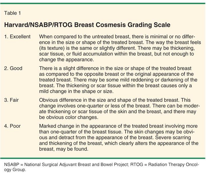 The NSABP and RTOG have adopted the Harvard scoring system in the ongoing partial breast protocol (NSABP B-39/RTOG 0413).[12] The RTOG is currently constructing a breast retreatment protocol. In our review of the literature, the established Harvard/NSABP/RTOG criteria to describe cosmetic outcomes have been used regularly, but there is no established consensus regarding cosmetic criteria in the retreated breast. In order to preserve uniformity of cosmetic evaluation between the de novo and retreated breast, we present a modification of the established criteria and scoring system.