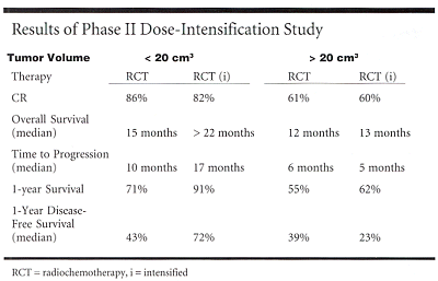 Initial data analysis showed no differences between the two regimens. Subgroup analysis stratified according to tumor volume showed that patients with tumors smaller than 20 cm³ had better response with the intensified regimen, especially in overall survival (median 22 months vs 15 months) and in time to progression (median 17 months vs 10 months). There was no effect in patients with larger tumors.