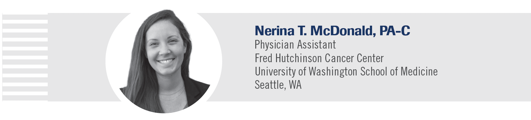 McDonald: I work with our [supportive care teams] very frequently. I let patients know when they come in that everyone’s journey through treatment is going to look different, and some patients will encounter certain toxicities more than others. I typically use our integrative medicine service. If patients have issues with neuropathy, there’s the option for acupuncture through that service. We have a great palliative care team at Fred Hutchinson, so they help with symptom management, ranging from constipation management to [management of] diarrhea, nausea, and emesis. Those are some of the ancillary services that I’ve found are helpful for patients on active therapy. Even for patients on a treatment break, those are good services to have available.