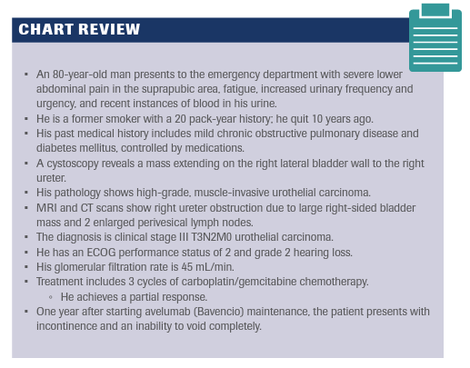 Weg: It’s unusual that the emergency department would call the radiation oncologist, but a lot of this patient’s presentation is typical. About 75% of patients with bladder cancer present with hematuria, and about 25% present with lower urinary tract symptoms such as frequency, urgency, discomfort, and voiding. The suprapubic pain and the dramatic nature of this presentation are a little unusual. Radiation oncology is usually roped into the picture once there’s already a proven tissue diagnosis.