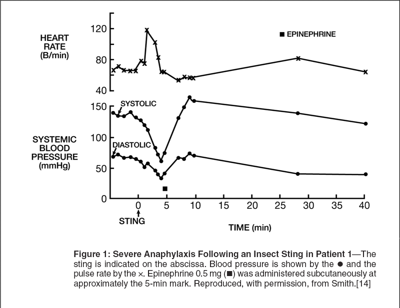 The courses of the reactions in two of the three patients with severe anaphylaxis from the Johns Hopkins immunotherapy study are shown in Figures 1 and 2.[14] Following the sting, patient 1 (Figure 1) complained of dizziness and nausea, and his systolic blood pressure sharply decreased from a baseline value of 140 mm Hg to approximately 60 mm Hg at 4 minutes. Placing the patient in the Trendelenburg position did not affect his blood pressure, but subcutaneous administration of epinephrine was associated with a return to baseline blood pressure during the next 2 to 3 minutes.