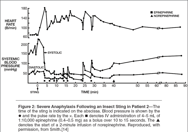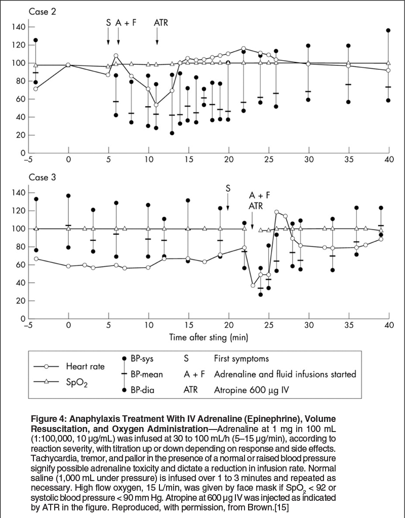 Patient 3 complained of a ‘‘lump in the throat’’ about 20 minutes after the sting challenge, followed 3 minutes later by unconsciousness, agonal respirations, and absent pulses. Adrenaline and saline infusions and atropine effectively restored normal vital signs. One hour after initiation of treatment, the adrenaline infusion was stopped; however, fl orid erythema developed with a fall in blood pressure and therapy was resumed. The patient subsequently recovered uneventfully.[15]