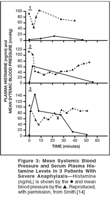 For example, patient 1, with the mildest of the reactions, had a plasma histamine level of approximately 15 ng/mL, whereas patient 3 with the most severe anaphylactic reaction had a level of approximately 140 ng/mL. Note further that the levels of histamine in the patient with the most severe anaphylaxis were still approximately 80 ng/mL at 30 minutes and remained increased for at least 40 minutes.[14]