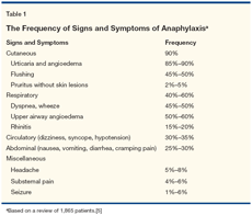 A review of 1,865 patients compiled the approximate frequency of the symptoms and signs characteristic of anaphylaxis (Table 1).[5] Cutaneous findings were most frequent, and 90% of patients undergoing an anaphylactic reaction showed skin changes such as urticaria, angioedema, flushing, and pruritus. Circulatory symptoms, such as dizziness, syncope, and hypotension, were experienced by 30% to 35% of patients, and these were clearly the most alarming, since they signaled impending circulatory collapse.